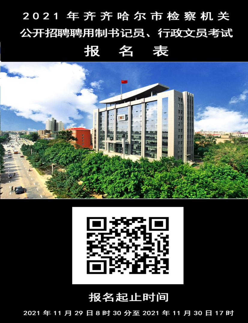 报名人员扫描公告最下方的二维码(附件2:《2021年齐齐哈尔市检察机关公开招聘聘用制书记员、行政文员考试报名表》),进行网上报名。